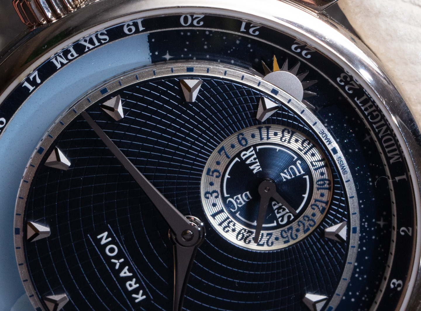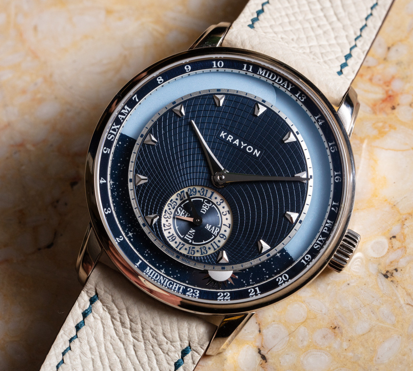 Krayon 是一个较新的瑞士手表品牌,由 Remi Maillat 先生创立,目前生产两种型号:高端的 Anywhere,我今天看到的,以及更高端的 Everywhere,它是一款具有类似复杂功能的手表这允许更多的用户可调节性。(稍后会详细介绍。)Krayon 的特别之处在于其机械表目前专注于展示优雅的日出/日落复杂功能——这是当今机械表中很少见到的功能,如果有的话。Anywhere 手表最让我印象深刻的是,它非常吸引人且合乎逻辑地显示当前时间,以及对一天中剩余多少日光的可视化显示。
