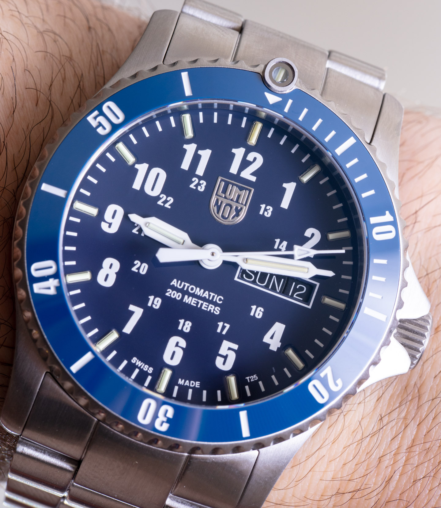 全拉丝精钢表壳给人一种不错的军用/工具表的感觉,这正是 Luminox 所追求的。表冠具有灵敏的表冠保护系统,表壳防水深度达 200 米。表盘上方是一块扁平的 AR 涂层蓝宝石水晶镜面,机芯上方是另一个蓝宝石水晶玻璃窗,可以看到内部的自动机芯。