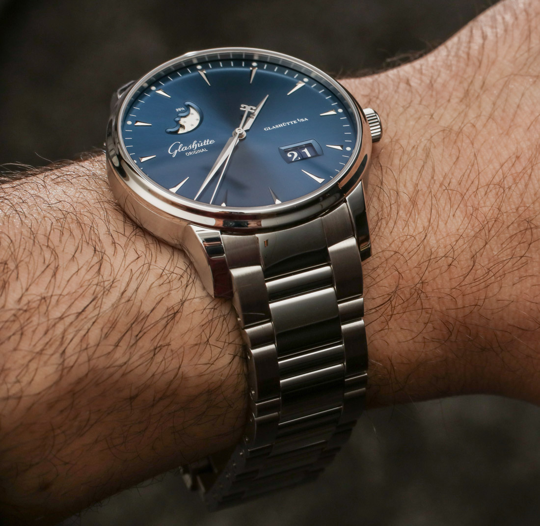 鉴于表壳和表盘的考究外观,可以发现 Senator Excellence Panorama Date Moon Phase 手表有点厚。虽然 42 毫米宽的表壳只有 12.2 毫米厚——在我看来这还不错。该表壳还具有 50m 的防水功能。格拉苏蒂原创在 42 毫米宽的 Senator Excellence Panorama Date Moon Phase 手表中提供三种表盘颜色(目前),它们是“镀锌银、镀锌蓝色和清漆哑光白”。这些颜色与同款 40 毫米宽款的银色表盘的其他形式略有不同。