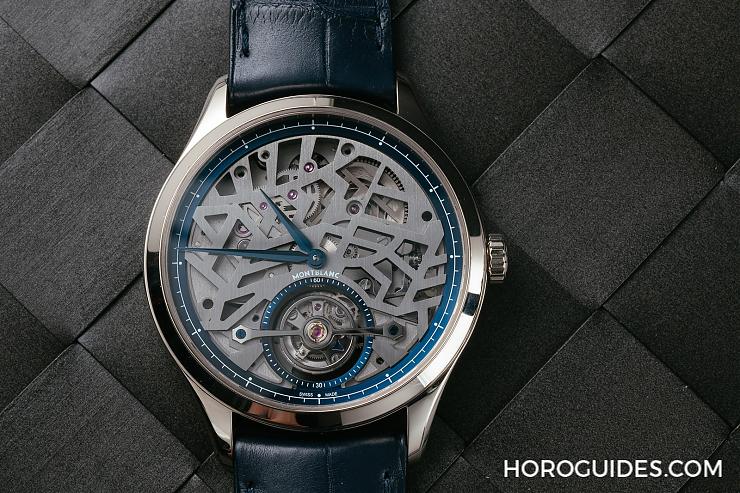 万宝龙全新推出的传承精密计时系列外置陀飞轮纤薄镂空腕表,以深灰色和蓝色鲜明对比的美学设计,另外也推出灰色表盘版本。