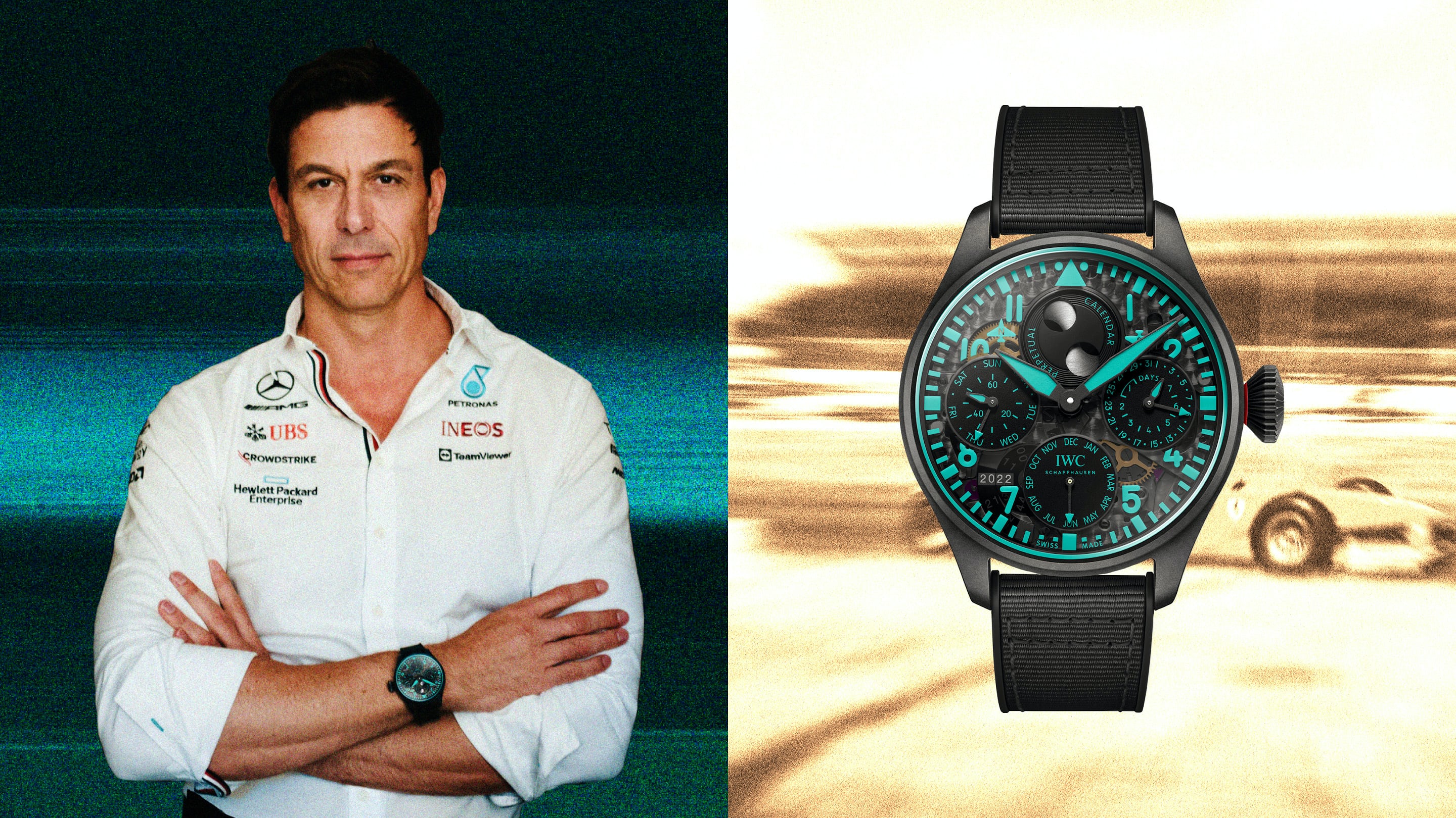 万国表在今年五月的迈阿密大奖赛上推出了一款团队腕表。从机械师到高管,每个人都获得了这款手表,您可以在比赛中将他们戴在手腕上。团队中的每个人都穿着一件——汽车大亨托托·沃尔夫除外。有人发现他穿着不同的衣服,但有一段时间,没人知道那是什么。